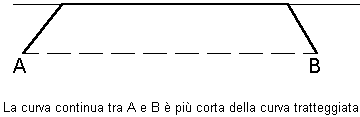![]() è conveniente raggiungere la strada mentre per due punti vicini tra loro ma lontani dalla strada la linea retta è sempre il percorso più breve. Cercando quindi un criterio che gli suggerisca in quali casi sia meglio servirsi della strada si pone il Terzo quesito: Qual è il percorso più breve (geodetica) che unisce due punti qualunque A e B della foresta? Per semplicità risponderemo a questo quesito solo nel caso in cui i due punti si trovano ad uguale distanza dalla strada (come avviene in entrambi i casi descritti nelle figure precedenti). In questo caso conviene considerare il punto M in cui l'asse di AB incontra la strada. Per la simmetria del problema, se il percorso minimo passa dalla strada, deve senz'altro passare anche da M. Verifichiamo quindi se il percorso minimo da A ad M (già risolto nel §2 pensando alla casa in M !) è più breve della metà del percorso rettilineo BA. In un sistema di coordinate centrato in M le coordinate di B ed A sono rispettivamente (xB, yB) e (-xB, yB). Posto a tale che sin a = v2/v1, la verifica richiesta equivale a Moltiplicando per v2 otteniamo x>B (sin a -1)+ yB cos a £ 0 Questa disuguaglianza è soddisfatta se ( xB, yB ) appartiene alla regione contenente l'asse delle ascisse e limitata dalle rette Queste due rette possono essere anche scritte come Il che mostra che quando v1 = v2 si identificano entrambe con l'asse delle ascisse. Pertanto per trovare la geodetica tra A e B (supposti al di sotto della strada) non dobbiamo fare altro che tracciare le due rette per M con coefficiente angolare ±Ö[(v1 - v2) / (v1 + v2)] La risposta è la seguente: se A e B sono interni alla regione determinata dalle due rette allora la geodetica coincide con il segmento che unisce A e B, altrimenti la geodetica passa da M ed è rappresentata in figura ![]() Per descrivere la geometria della regione introduciamo adesso un punto di vista completamente nuovo. Definiamo la distanza tra due punti come il tempo minimo che impieghiamo per andare dall'uno all'altro e corrispondentemente definiamo la lunghezza di una curva come il tempo impiegato a percorrerla. Con questo punto di vista (abbiamo cambiato la misura delle lunghezze!) le geodetiche sono le curve più corte tra quelle che uniscono due punti. Ad esempio abbiamo ![]() Adesso il nome "circonferenza" del ciclista assume pieno significato perchè essa viene vista come luogo dei punti equidistanti da un punto dato, esattamente come avviene per la circonferenza euclidea (vedi §1). Non sappiamo se il ciclista sia arrivato a questa conclusione, ma questo punto di vista si è fatto strada faticosamente nella storia della scienza, e può essere ricondotto essenzialmente alla nascita delle geometrie non euclidee, avvenuta intorno al 1830 per l'opera (indipendente) di J. Bolyay e N.I Lobacevskij. Essi riconobbero che sostituendo alla parola "retta" la parola "geodetica" era possibile ripetere gran parte degli Elementi di Euclide. Dalla lettura delle lettere private di K.F. Gauss risulta che egli aveva sviluppato un punto di vista analogo 20 anni prima ma non osò mai renderlo pubblico perchè temeva "le strida dei beoti". Più avanti accenneremo alle implicazioni logiche e filosofiche che rendevano prudente Gauss tanto da fargli scrivere questa famosa espressione. Può fare comunque riflettere che due secoli dopo il processo a Galileo da parte dell'Inquisizione, la libertà di pensiero nelle opinioni scientifiche era tutt'altro che acquisita. §4 UNA PARENTESI SULL'OTTICA GEOMETRICA Ci proponiamo ora di studiare quali sono i percorsi minimi in un piano che è diviso in due parti da una retta. In un semipiano ci si può muovere a velocità v1 mentre nell'altro la velocità è v2. Siano A e B due punti posti nei due semipiani diversi.