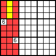 La striscia verticale centrale non ha coppie. La terza striscia ha una coppia di 6. Il terzo 6 andrà nella cella verde, essendo l'altra in basso bloccata da un 6 a sinistra sulla terza riga. La terza striscia verticale ha anche una coppia di 8, ma non possiamo