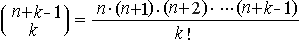 ![]() Ad esempio, con le 5 lettere ABCDE, prese a tre a tre, dovremo trovare tre fattoriali crescenti a partire da 5 e dividere per 3!. Avremo: ![]() Cioè = 35 parole diverse di tre lettere, anche ripetute più volte all'interno di una parola. Poniamo il seguente quesito: quante combinazioni con ripetizione si possono formare con n elementi presi a due a due? Occorre calcolare il fattoriale crescente di 2 elementi a partire da n, cioè n(n + 1). Calcoliamo anche il fattoriale di 2, che vale semplicemente 2. Applicando tali risultati alla formula precedente, avremo: